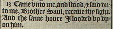 13 Came vnto me, and stood, & said vnto me, Brother Saul, receiue thy sight. And the same houre I looked vp vpon him.