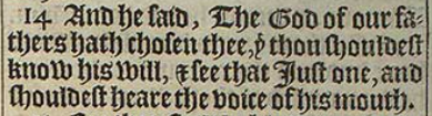 14 And he said, The God of our fathers hath chosen thee, þt thou shouldest know his will, & see that Iust one, and shouldest heare the voice of his mouth.
