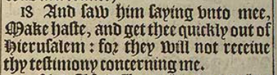 18 And saw him saying vnto mee, Make haste, and get thee quickly out of Hierusalem: for they will not receiue thy testimony concerning me.