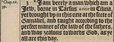 3 *I am verely a man which am a Iew, borne in Tarsus a citie in Cilicia, yet brought vp in this citie at the feete of Gamaliel, and taught according to the perfect maner of the law of the fathers, and was zealous towards God, as ye all are this day.[*Chap.21. 39.]