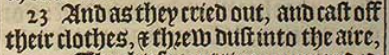 23 And as they cried out, and cast off their clothes, & threw dust into the aire,