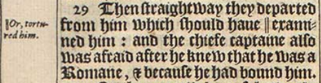 29 Then straightway they departed from him which should haue || examined him: and the chiefe captaine also was afraid after he knew that he was a Romane, & because he had bound him.[|| Or, tortured him.]