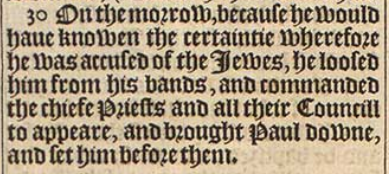 30 On the morrow, because he would haue knowen the certaintie wherefore he was accused of the Iewes, he loosed him from his bands, and commanded the chiefe Priests and all their Councill to appeare, and brought Paul downe, and set him before them.