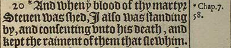 20 *And when þe blood of thy martyr Steuen was shed, I also was standing by, and consenting vnto his death, and kept the raiment of them that slew him.[*Chap.7. 58.]