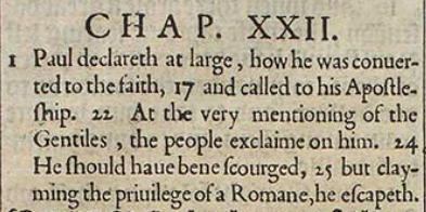 1 Paul declareth at large, how he was conuerted to the faith, 17 and called to his Apostleship. 22 At the very mentioning of the Gentiles, the people exclaime on him. 24 He should haue bene scourged, 25 but clayming the priuilege of a Romane, he escapeth.