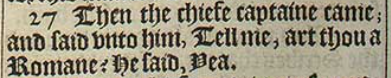 27 Then the chiefe captaine came; and said vnto him, Tell me, art thou a Romane? He said, Yea.