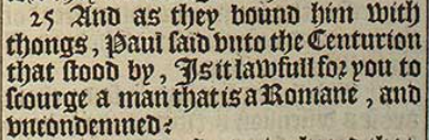 25 And as they bound him with thongs, Paul said vnto the Centurion that stood by, Is it lawfull for you to scourge a man that is a Romane, and vncondemned?