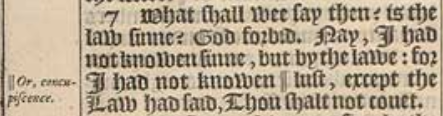 7 What shall wee say then? is the law sinne? God forbid. Nay, I had not knowen sinne, but by the lawe: for I had not knowen || lust, except the Law had said, Thou shalt not couet.[|| Or, concupiscence.]