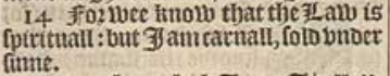 14 For wee know that the Law is spirituall: but I am carnall, sold vnder sinne.