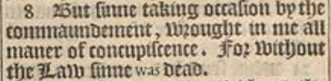 8 But sinne taking occasion by the commaundement, wrought in me all maner of concupiscence. For without the Law sinne was dead.