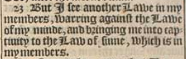 23 But I see another Lawe in my members, warring against the Lawe of my minde, and bringing me into captiuity to the Law of sinne, which is in my members.