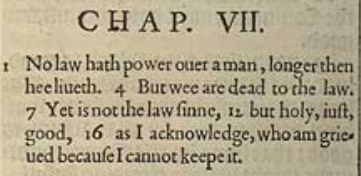 1 No law hath power ouer a man, longer then hee liueth. 4 But wee are dead to the law. 7 Yet is not the law sinne, 12 but holy, iust, good, 16 as I acknowledge, who am grieued because I cannot keepe it.