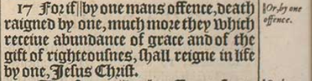 17 For if ||by one mans offence, death raigned by one, much more they which receiue abundance of grace and of the gift of righteousnes, shall reigne in life by one, Iesus Christ.[|| Or, by one offence.]