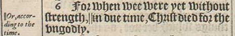 6 For when wee were yet without strength, ||in due time, Christ died for the vngodly. [ || Or, according to the time. ]