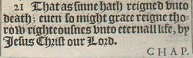 21 That as sinne hath reigned vnto death; euen so might grace reigne thorow righteousnes vnto eternall life, by Iesus Christ our Lord.