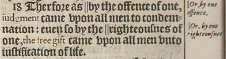 18 Therfore as ||by the offence of one, iudgment came vpon all men to condemnation: euen so by the || righteousnes of one, the free gift came vpon all men vnto iustification of life.[|| Or, by one offence. , ||Or, by one righteousnes]