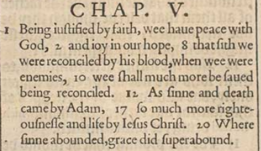 1 Da wir durch den Glauben gerechtfertigt sind, haben wir Frieden mit Gott, 2 und sind getrost in der Hoffnung, 8 dass nachdem wir durch sein Blut ausgesöhnt wurden, als wir Feinde waren, 10 wir, ausgesöhnt, umso mehr errettet sein werden. 12 Wie Sünde und Tod durch Adam kamen, 17 so viel mehr Rechtschaffenheit und Leben durch Jesus Christus. 20 Wo Sünde reichlich war, war Gunst überreichlich.