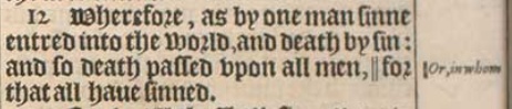 12 Wherefore, as by one man sinne entred into the world, and death by sin: and so death passed vpon all men, ||for that all haue sinned. [ || Or, in whom ]