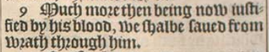 9 Much more then being now iustified by his blood, we shalbe saued from wrath through him.