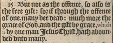 15 But not as the offence, so also is the free gift: for if through the offence of one, many bee dead: much more the grace of God, and the gift by grace, which is by one man Iesus Christ, hath abounded vnto many.