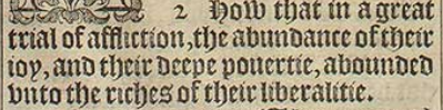 2 How that in a great trial of affliction, the abundance of their ioy, and their deepe pouertie, abounded vnto the riches of their liberalitie.