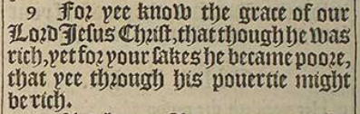 9 For yee know the grace of our Lord Iesus Christ, that though he was rich, yet for your sakes he became poore, that yee through his pouertie might be rich.