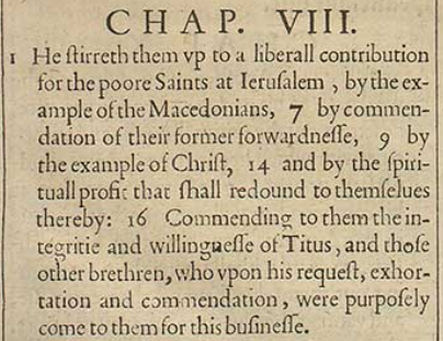 1 Er regt sie zu einer freien Spende für die armen Heiligen in Jerusalem an, durch das Beispiel der Mazedonier, 7 durch Lob ihrer früheren Voraussicht, 9 durch das Beispiel von Christus 14 und durch den geistlichen Gewinn, der ihnen dadurch zuteil wird: 16 Ihnen die Integrität und Willigkeit des Titus lobend und jene anderen Brüder, die auf seine Bitte, Ermahnung und Lob bewusst zu diesem Vorhaben zu ihnen kamen.