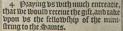 4 Praying vs with much entreatie, that we would receiue the gift, and take vpon vs the fellowship of the ministring to the Saints.