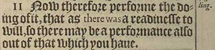 11 Now therefore performe the doing of it, that as there was a readinesse to will, so there may be a performance also out of that which you haue.