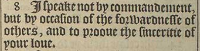 8 I speake not by commandement, but by occasion of the forwardnesse of others, and to prooue the sinceritie of your loue.