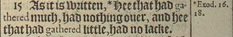 15 As it is written, *Hee that had gathered much, had nothing ouer, and hee that had gathered little, had no lacke. [*Exod. 16. 18.]