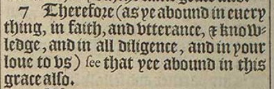 7 Therefore (as ye abound in euery thing, in faith, and vtterance, & knowledge, and in all diligence, and in your loue to vs) see that yee abound in this grace also.