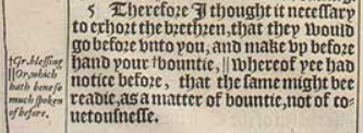 5 Therefore I thought it necessary to exhort the brethren, that they would go before vnto you, and make vp before hand your +bountie, ||whereof yee had notice before, that the same might bee readie, as a matter of bountie, not of couetousnesse.[+Gr. blessing , ||Or, which hath bene so much spoken of before.]