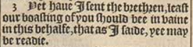 3 Yet haue I sent the brethren, least our boasting of you should bee in vaine in this behalfe, that as I saide, yee may be readie.