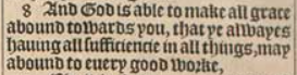 8 And God is able to make all grace abound towards you, that ye alwayes hauing all sufficiencie in all things, may abound to euery good worke,