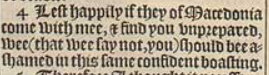 4 Lest happily if they of Macedonia come with mee, & find you vnprepared, wee (that wee say not, you) should bee ashamed in this same confident boasting.