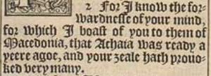 2 For I know the forwardnesse of your mind, for which I boast of you to them of Macedonia, that Achaia was ready a yeere agoe, and your zeale hath prouoked very many.