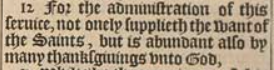 12 For the administration of this seruice, not onely supplieth the want of the Saints, but is abundant also by many thanksgiuings vnto God,