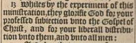 13 Whiles by the experiment of this ministration, they glorifie God for your professed subiection vnto the Gospel of Christ, and for your liberall distribution vnto them, and vnto all men: