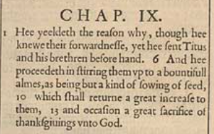 1 Hee yeeldeth the reason why, though hee knewe their forwardnesse, yet hee sent Titus and his brethren before hand. 6 And hee proceedeth in stirring them vp to a bountifull almes, as being but a kind of sowing of seed, 10 which shall returne a great increase to them, 13 and occasion a great sacrifice of thanksgiuings vnto God.