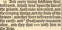 23 And euery liuing substance was destroyed, which was vpon the face of the ground, both man and cattell, and the creeping things, and the foule of the heauen; and they were destroyed from the earth: and * Noah onely remained aliue, and they that were with him in the Arke. [ *Wisd. 10. 4.2. pet.2.5 ]