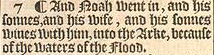 7 ¶ And Noah went in, and his sonnes, and his wife, and his sonnes wiues with him, into the Arke, because of the waters of the Flood.