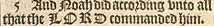 5 Und Noah tat entsprechend allem, was ihm der HERR geboten hatte.
