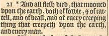 21 *And all flesh died, that mooued vpon the earth, both of fowle, & of cattell, and of beast, and of euery creeping thing that creepeth vpon the earth, and euery man.[*Wisd.10. 4.]