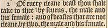 2 Von jedem reinen Tier sollst du +je sieben und sieben nehmen, das Männchen und sein Weibchen: Und von den nicht reinen Tieren zwei, das Männchen und sein Weibchen.[+sieben sieben]