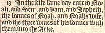 13 In the selfe same day entred Noah, and Sem, and Ham, and Iapheth, the sonnes of Noah, and Noahs wife, and the three wiues of his sonnes with them, into the Arke,