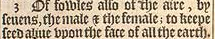 3 Of fowles also of the aire, by seuens, the male & the female; to keepe seed aliue vpon the face of all the earth.