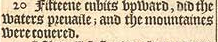 20 Fifteene cubits vpward, did the waters preuaile; and the mountaines were couered.
