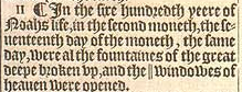 11 ¶ Im sechshundersten Jahr von Noahs Leben, im zweiten Monat, dem siebzehnten Tag des Monats, an eben diesem Tag, wurden alle Fontänen der großen Tiefe aufgebrochen und die ||Fenster des Himmels wurden geöffnet.[||oder: Fluttore]