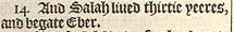 14 And Salah liued thirtie yeeres, and begate Eber.